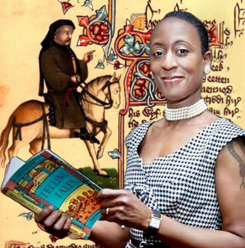 Geoffrey Chaucer as a pilgrim, and Patience Agbabi with Telling Tales.
